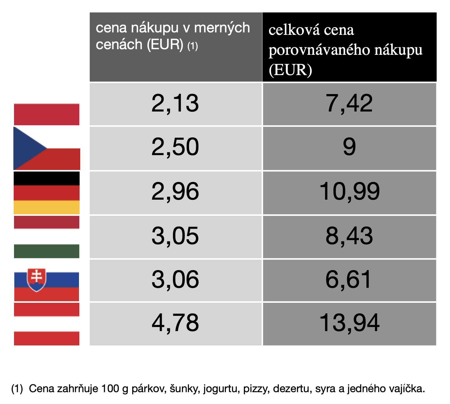 Napríklad v Maďarsku sme za ten istý tovar v nižšej kvalite zaplatili 3,05 EUR. Vôbec najdrahšie vyšli chladené a mrazené potraviny v Rakúsku, kde by sme za náš „špecifický“ košík nechali 4,78 EUR. Za veľkým rozdielom stoja predovšetkým výrazne drahšie rakúske údeniny a vajcia.