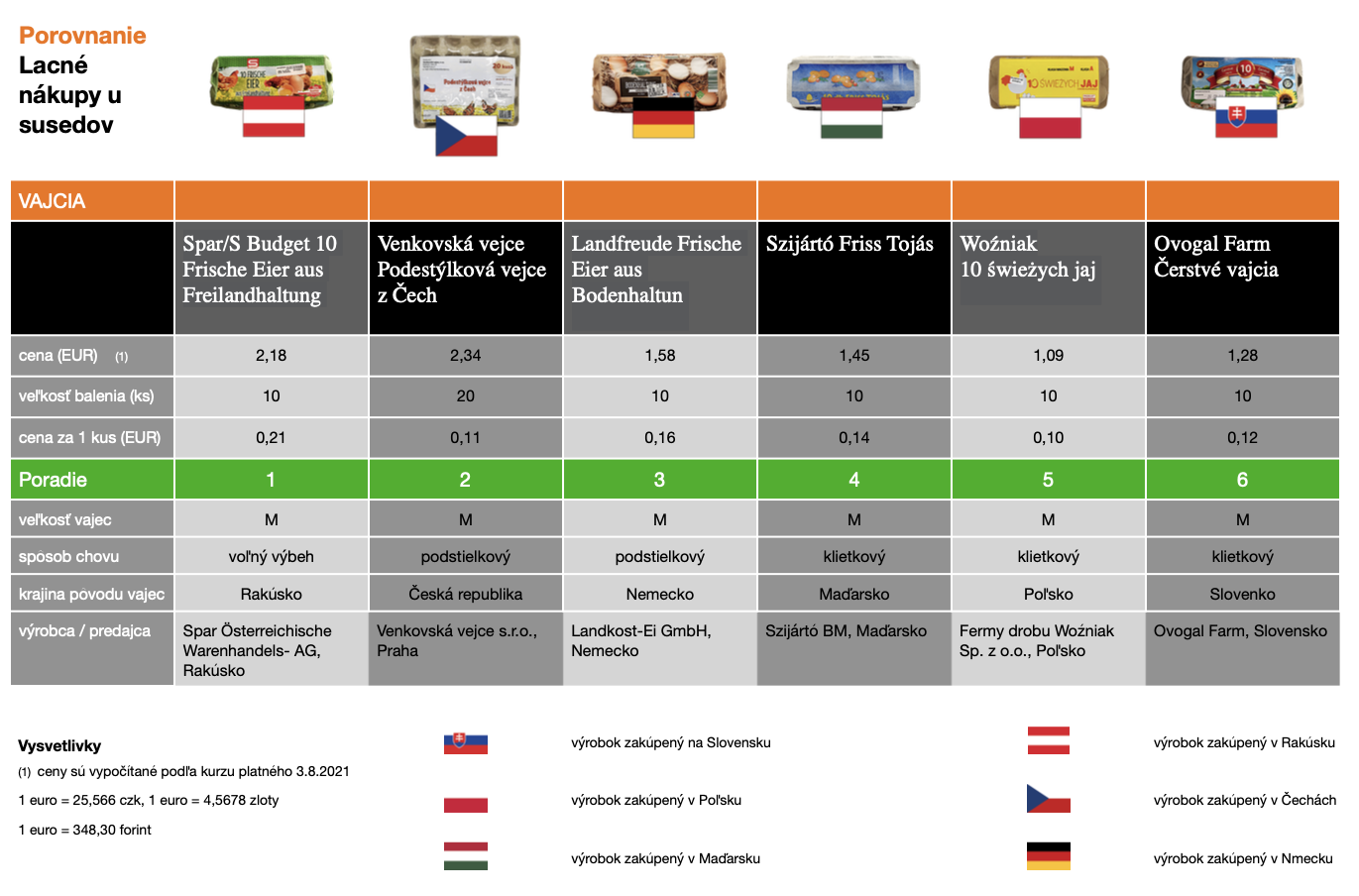 Prvú priečku obsadili rakúska vajíčka z voľného výbehu (kód 1), po nich prišli české a nemecké podstielkové vajcia (alias vajcia z halového chovu s kódom 2). Maďarské, poľské a slovenské vajíčka z klietkového chovu (kód 3) skončili na posledných troch miestach (v tabuľke v abecednom poradí).