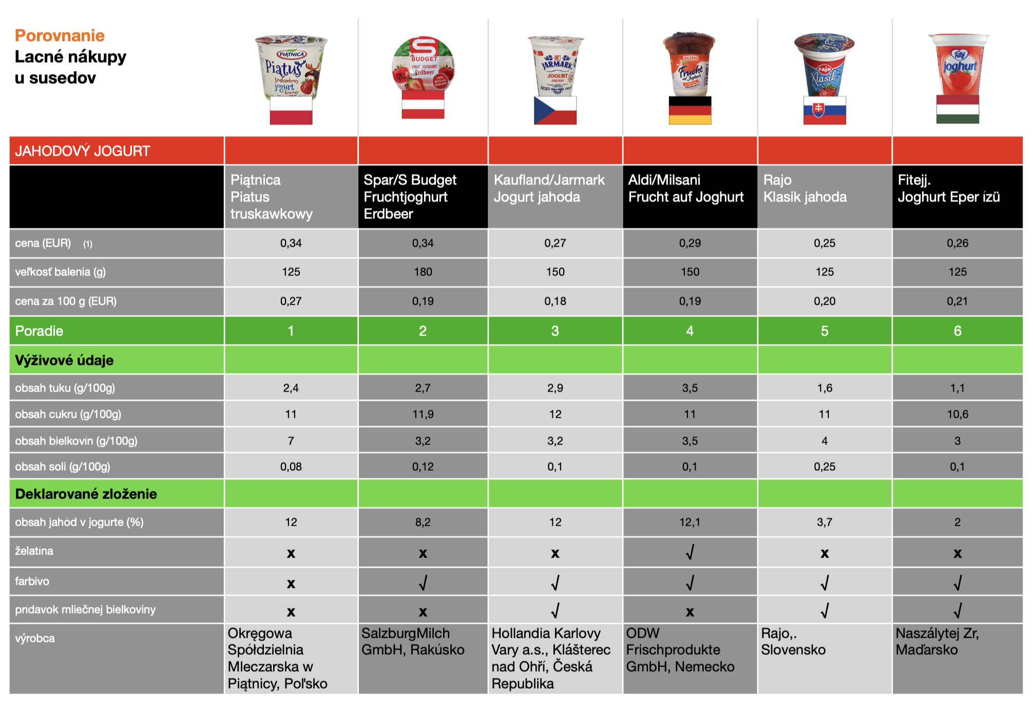 U všetkých doteraz spomínaných produktov patrili prvé miesta výrobkom z nemecky hovoriacich krajín. V prípade jahodových jogurtov sme najlepší výrobok našli v Poľsku. Tamojší jogurt nás zaujal vysokým obsahom bielkovín, a ako jediný dokázal jahodovú dochucujúcu zložku vytvoriť bez pridaných farbív. Na druhej strane musíme uznať, že s cenou 0,27 EUR/100 g išlo o vôbec najdrahší jogurt v našom výbere.