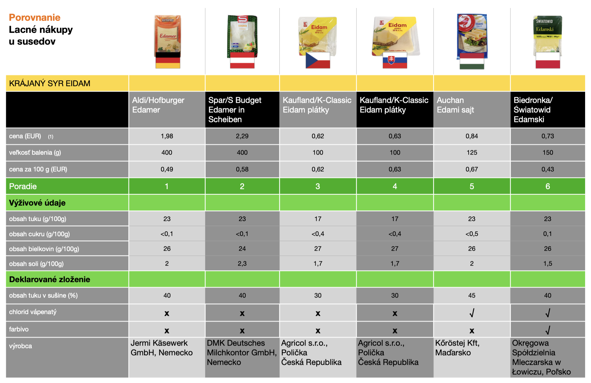 Pri plátkovom eidame bol jasným hlavným kritériom obsah tuku v sušine. České a slovenské predajne ponúkali najlacnejšie eidam s 30%-tami tuku v sušine. Všade inde eidam začínal na 40% až 45% tuku v sušine, čo u nás predstavuje drahší akostný stupeň. Napriek tomu, český a slovenský 30%-ný eidam obsadil prostrednú priečku. V ich prospech totiž zahral vyšší obsah bielkovín a tiež fakt, že sa obišli bez akýchkoľvek prídavných látok.