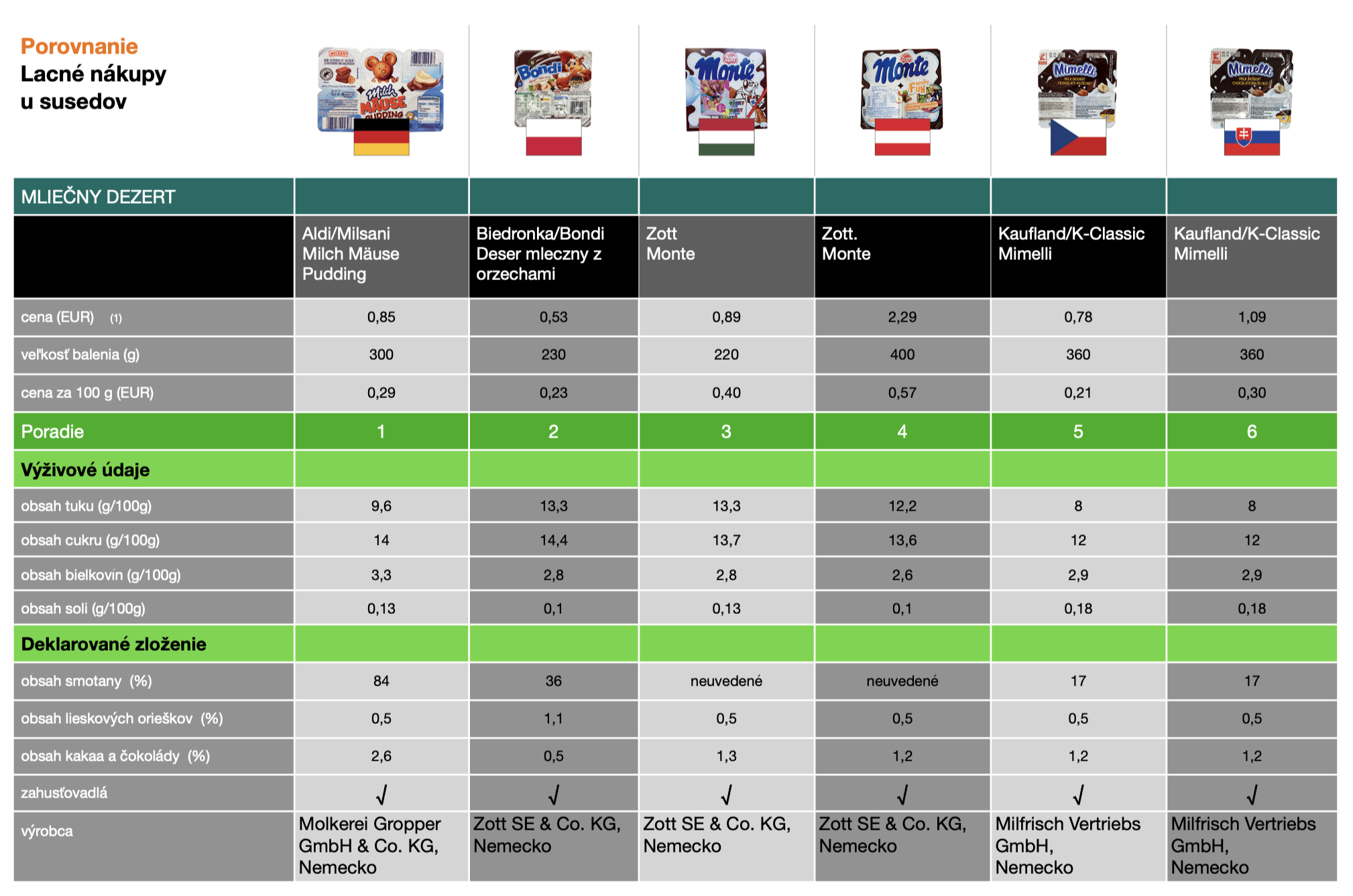 Poslední zástupcovia mliečneho sortimentu sú určení najmä deťom, a ide o mliečne dezerty s lieskovými orieškami a kakaom pripomínajúce dezert Zott Monte. Z Rakúska a Maďarska sme doviezli priamo originály, z ostatných krajín len jeho napodobeniny. U maďarského a rakúskeho Monte nás prekvapilo mierne odlišné zloženie, menej sa nám páčila rakúska varianta. Mala totiž nižší obsah tuku, kakaového prášku a obsahovala prídavok škrobu navyše. Prvé miesto pripadlo dezertu z nemeckého Aldi, predovšetkým zásluhou vysokého obsahu kakaa a čokolády. V Česku a na Slovensku sa ponúkal rovnaký výrobok, ktorý v našom hodnotení skončil posledný. Dôvodom bol predovšetkým najnižší obsah mliečneho tuku.