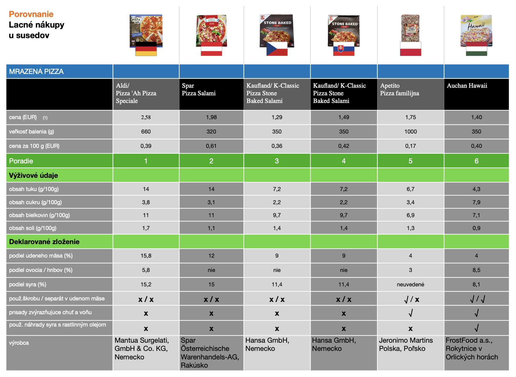 Najstudenší výrobok v našom porovnaní predstavovala mrazená pizza s údeninou. V jej prípade sme sa zamerali na množstvo dôležitých ingrediencií a ich kvalitu. Bohužiaľ sme naprieč všetkými krajinami nedokázali nájsť jeden spoločný druh, a nazbierala sa nám pestrá škála šunkových a salámových pízz. Aj u nich bolo možné sledovať nami vybrané kritériá.