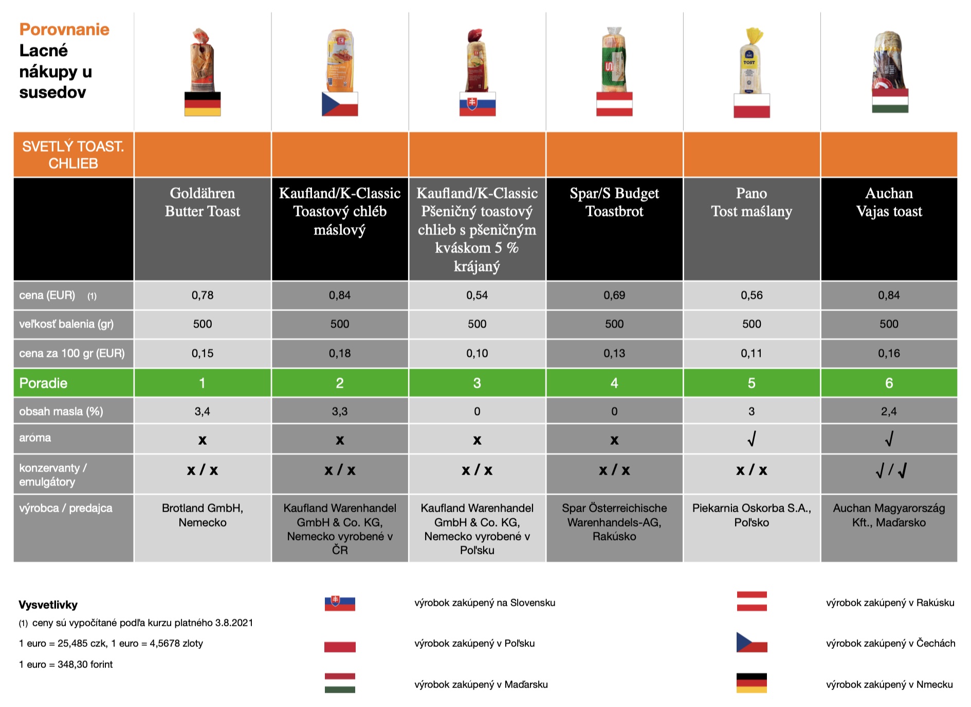 Okrem chladených produktov, o ktorých sme informovali minulý mesiac, sme zamierili aj k nechladeným regálom a hľadali v nich dva druhy toustového chleba, maslové sušienky, ovocnú a mäsovú detskú výživu a pomarančový nápoj v tetrapackovom balení, pripomínajúcom pomarančový džus. Vždy sme vyberali ako zákazníci, ktorí nehovoria cudzím jazykom, teda iba podľa vzhľadu výrobkov. Druhým kritériom bola najnižšia cena (cena za 100 g výrobku, nie za celé balenie).