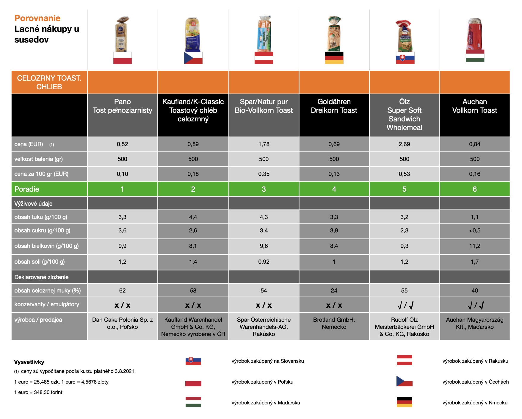 Z dôležitých ingrediencií nás pri celozrnných chleboch zaujímal samozrejme aj podiel celozrnnej múky. Najväčším množstvom sa mohla pochváliť etiketa poľského výrobku (62%), na opačnom konci skončil nemecký výrobok s 24%. Slovenský tovar obsadil s 55% celozrnnej múky tretie miesto.