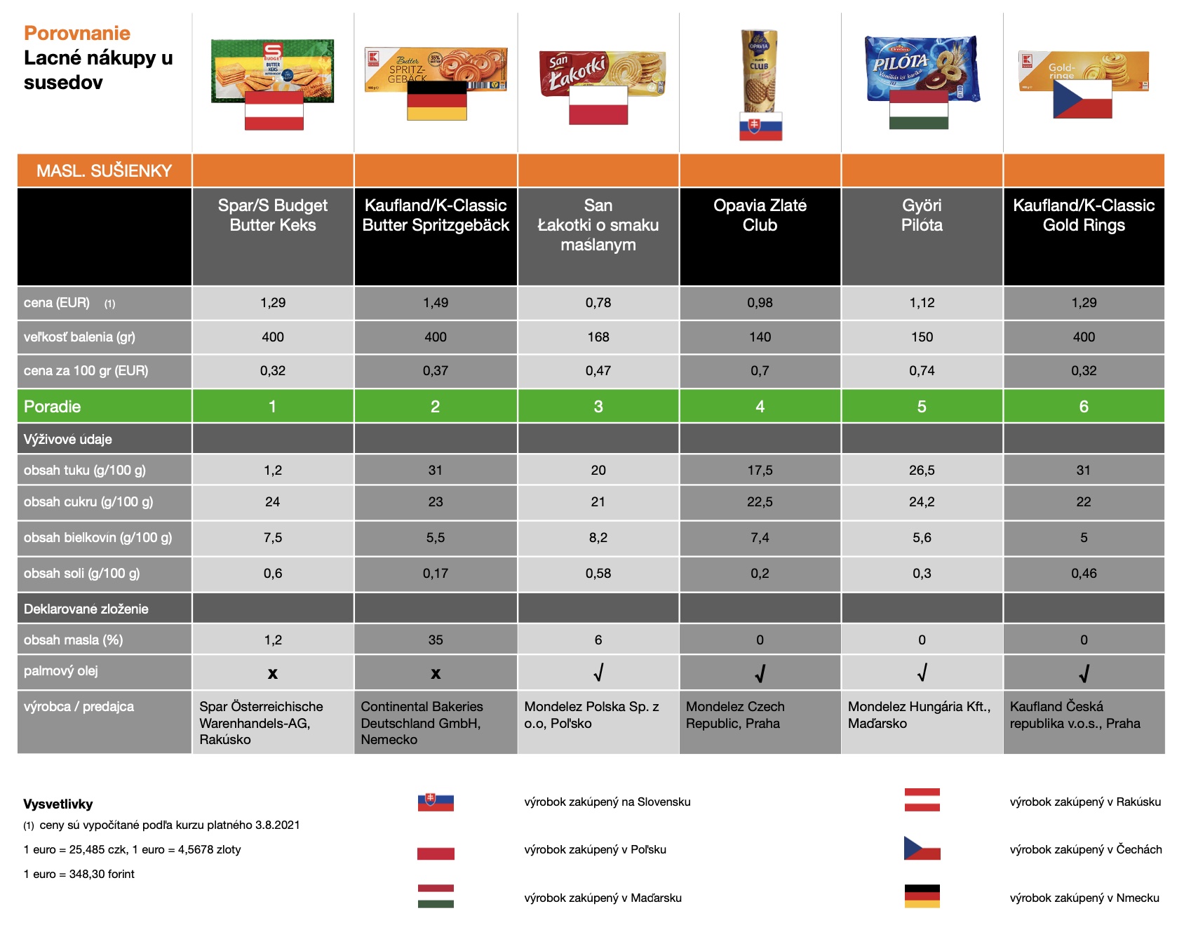 V lete sme sa v ankete na našom facebookovom profile spotrebiteľov opýtali, čo chodia do zahraničia nakupovať najčastejšie. Na treťom mieste vtedy skončili sladkosti a tie v našom nákupnom košíku zastúpili sušienky. Pôvodne sme mali na mysli okrúhle sušienky evokujúce maslové pečivo, no pri ich nákupe sme narazili na problémy. V nemeckom Aldi sme našli len prázdne miesto a cenovku. Pri druhom pokuse o nákup už v Aldi nemali ani cenovku, preto sme zašli do nemeckého Kauflandu. Problémy prišli aj v Rakúsku a Maďarsku, kde sme museli vybrať maslové sušienky iného typu. Vo všetkých prípadoch nás zaujímal obsah cukru a výživné hodnoty.