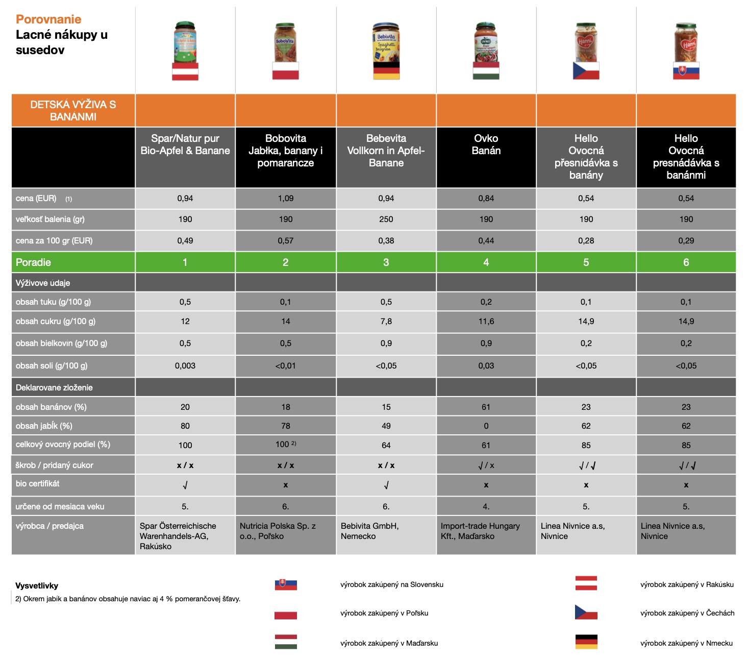 Všetky spomínané kritériá sme vzali do úvahy a vďaka nim sa nám podarilo banánové výživy zreteľne rozdeliť. Prvé miesto patrí rakúskej bio jablkovo-banánovej výžive so 100% ovocným podielom. O posledné miesto tabuľky sa delia v Česku a na Slovensku kúpené banánové výživy Hello. Posledné miesto im pripadlo najmä kvôli deklarovanému pridaniu cukru, čo sme pri banánových výživách nečakali. Najnižší ovocný podiel (61%) deklarovala maďarská vzorka.