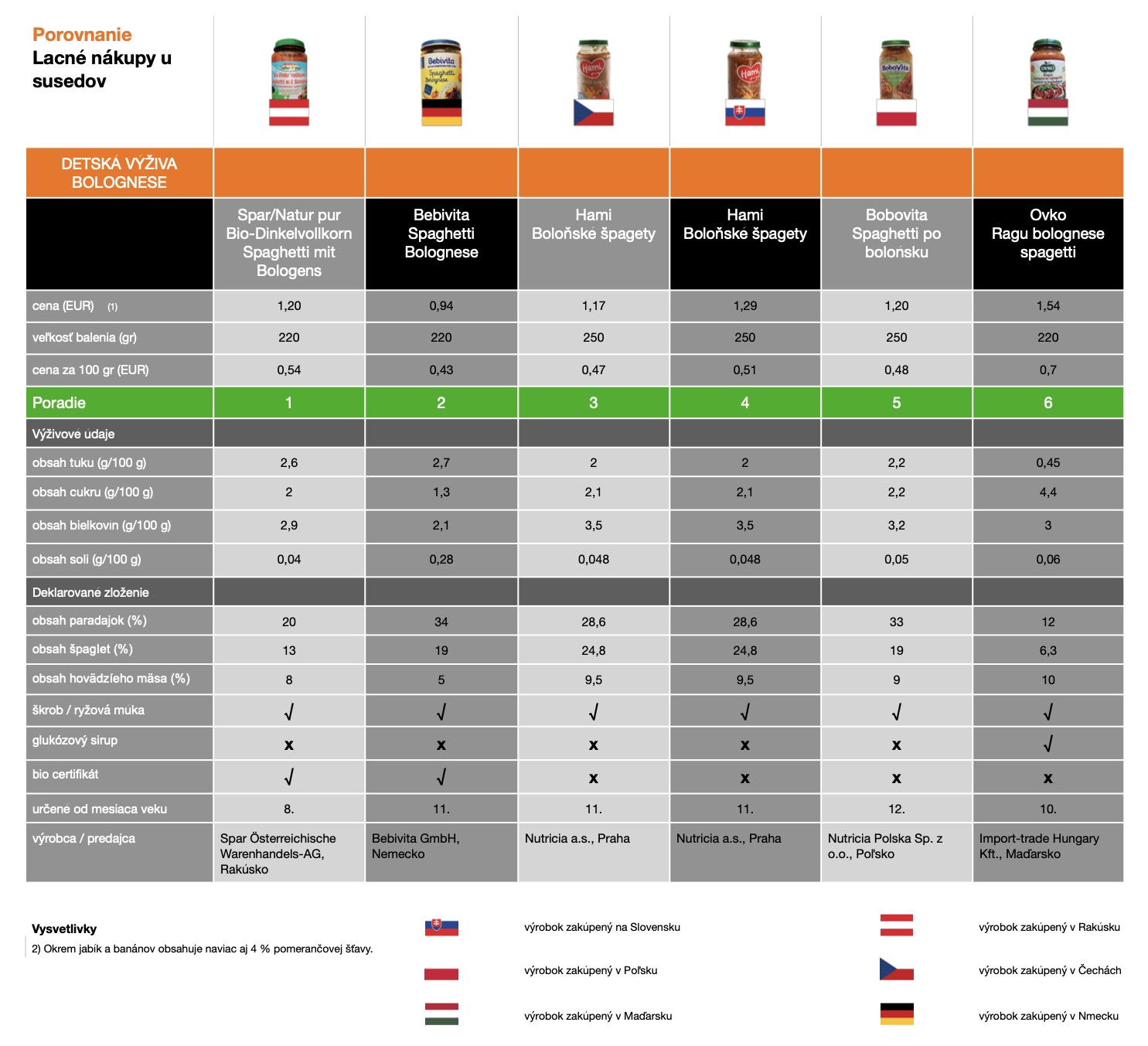 U detských výživ nás zaujímali aj cenové rozdiely. Pri porovnaní výrobkov pre malé deti totiž pred dvoma rokmi dTest zistil, že nemecký tovar je lacnejší ako slovenský. Aktuálne čísla to potvrdili len čiastočne – banánová výživa bola na Slovensku lacnejšia (0,29 EUR/100 g vs. 0,38 EUR/100 g), naše bolonské špagety však naopak vyšli drahšie (0,51 EUR/100 g vs. 0.43 EUR) 100 g).