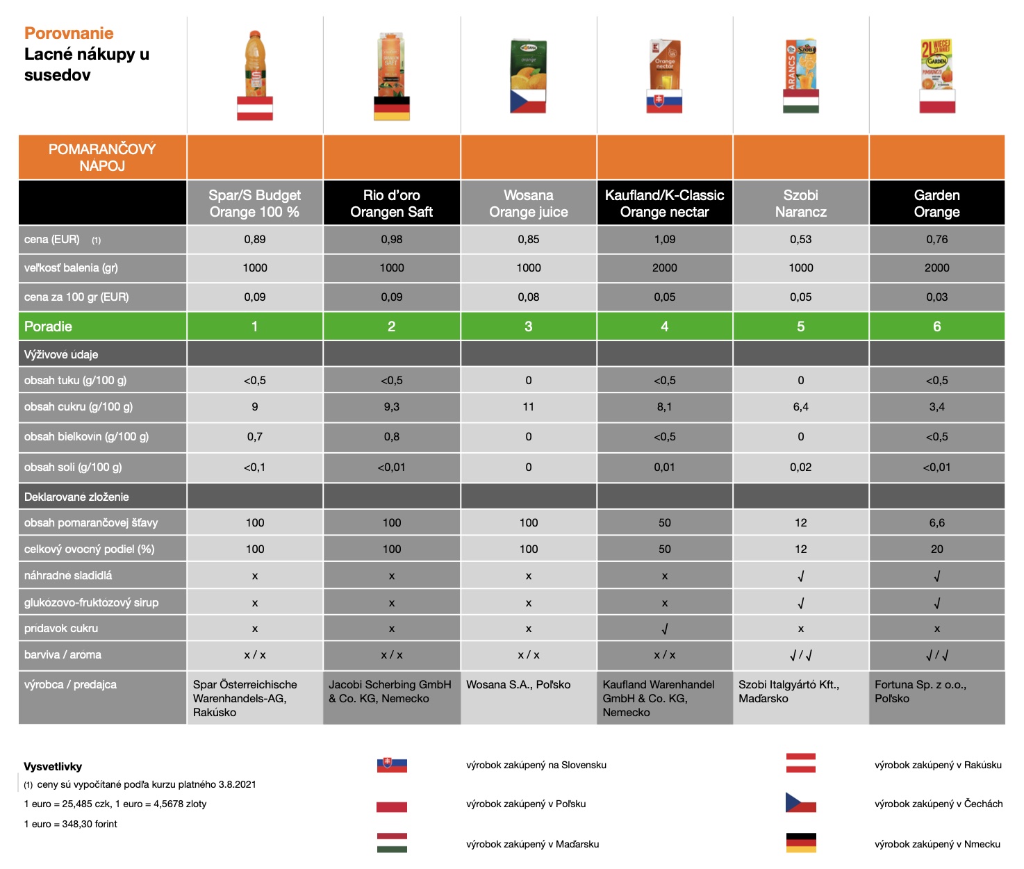 Z nákupu sme si trikrát priniesli pomarančový džús, jeden nektár a dva ovocné nápoje. 100% pomarančovú šťavu z koncentrátu sme si priviezli z Čiech, Nemecka a Rakúska. Nektár s 50% ovocným podielom bol zo slovenského obchodu, v Poľsku a Maďarsku sa za najnižšiu cenu predávali pomarančové ovocné nápoje s 6,6%, respektíve 12% pomarančovej šťavy.